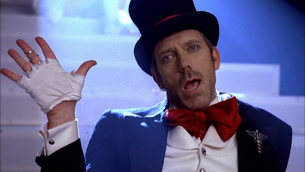 In a dream Cuddy has during the Season 7 episode Bombshells, House is dressed as a circus ringmaster, complete with top hat, floppy bow tie and fingerless gloves.