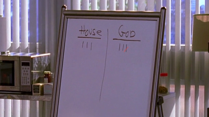 The patient comes into House's office and sees that someone is keeping score on the whiteboard - God 2, House 1. House tells the patient that his faith healing is merely the result of a rush of endorphins in the people at the services. The patient says that House only wants to be alone, and House brushes it off as an obvious conclusion. However, the patient then tells House that God wants him to invite Wilson to the poker game. However, when House confronts Wilson, he denies ever speaking to the patient except when he found him with his patient.